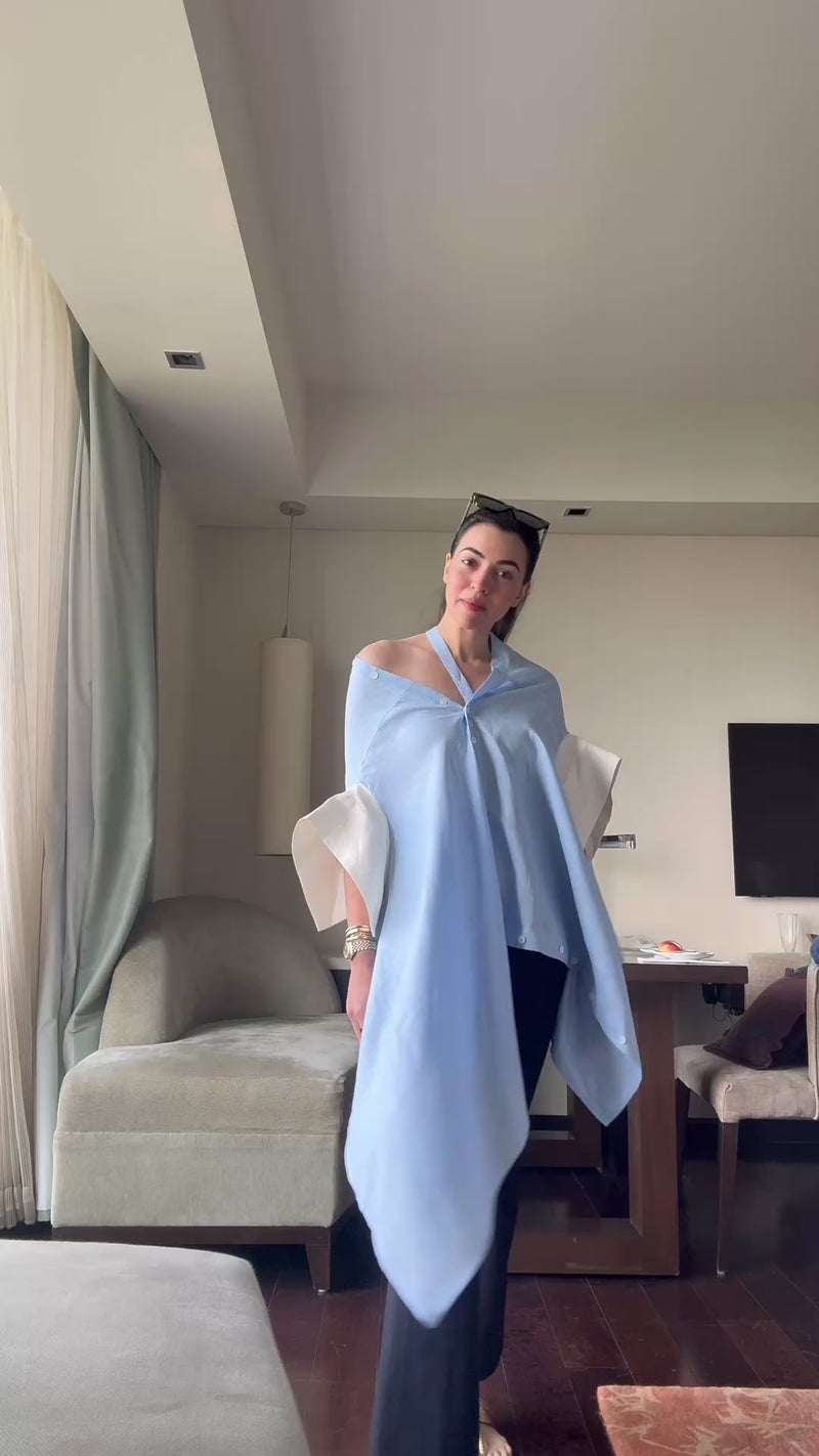 Wrapped in a soothing-blue palette, this ensemble balances ease with precision tailoring. The asymmetrical top, accented by a crisp blue panel, drapes effortlessly, creating movement with every step. Paired with fluid wide-leg jeans in cotton denim, it speaks to an aesthetic of quiet confidence and effortless sophistication.